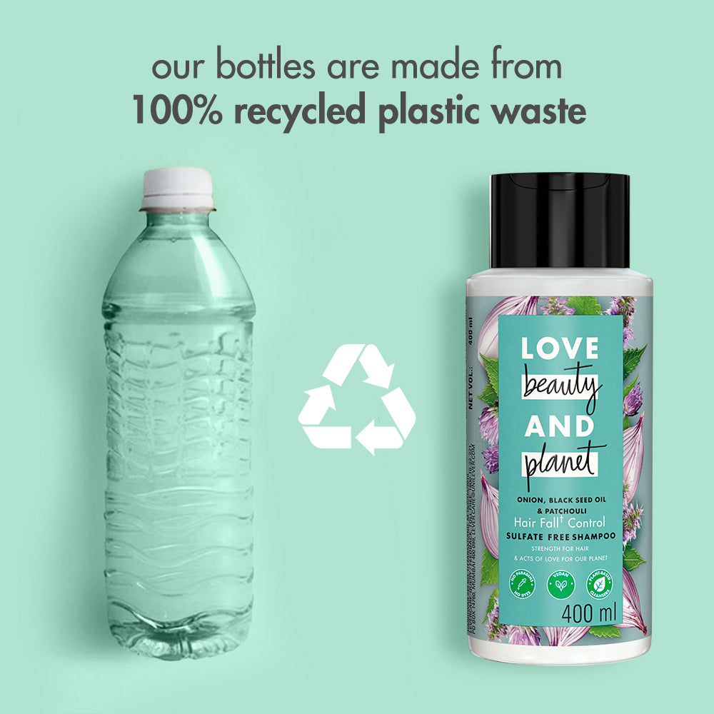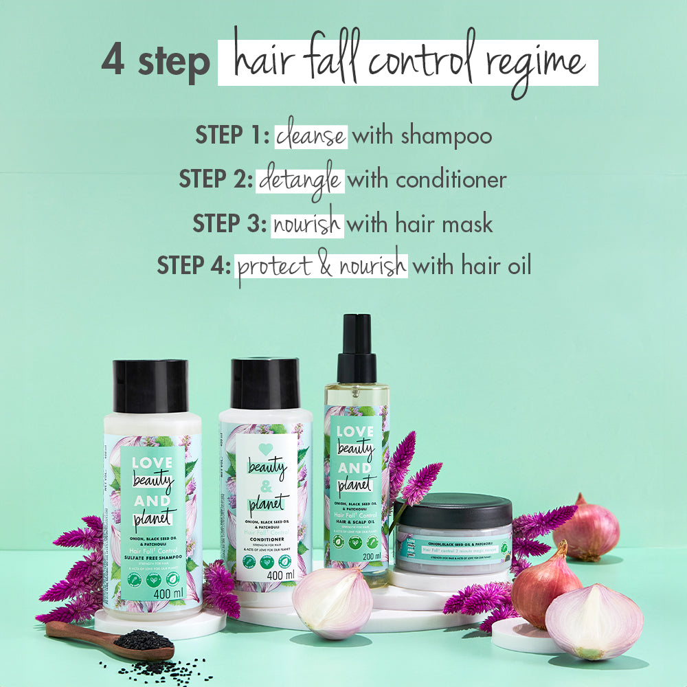 Experience 75% less hair fall* with Love Beauty And Planet's Onion, Blackseed & Patchouli Hair Fall Control Shampoo. Infused with organic onion and blackseed oil, this shampoo helps to strengthen hair and nourish the scalp for healthy-looking hair. Our vegan formula is cruelty-free, has no parabens, dyes, and sulfates and is packaged in 100% recycled plastic. Also try our Onion, Blackseed & Patchouli conditioner, mask, and scalp serum for stronger, healthier hair.
