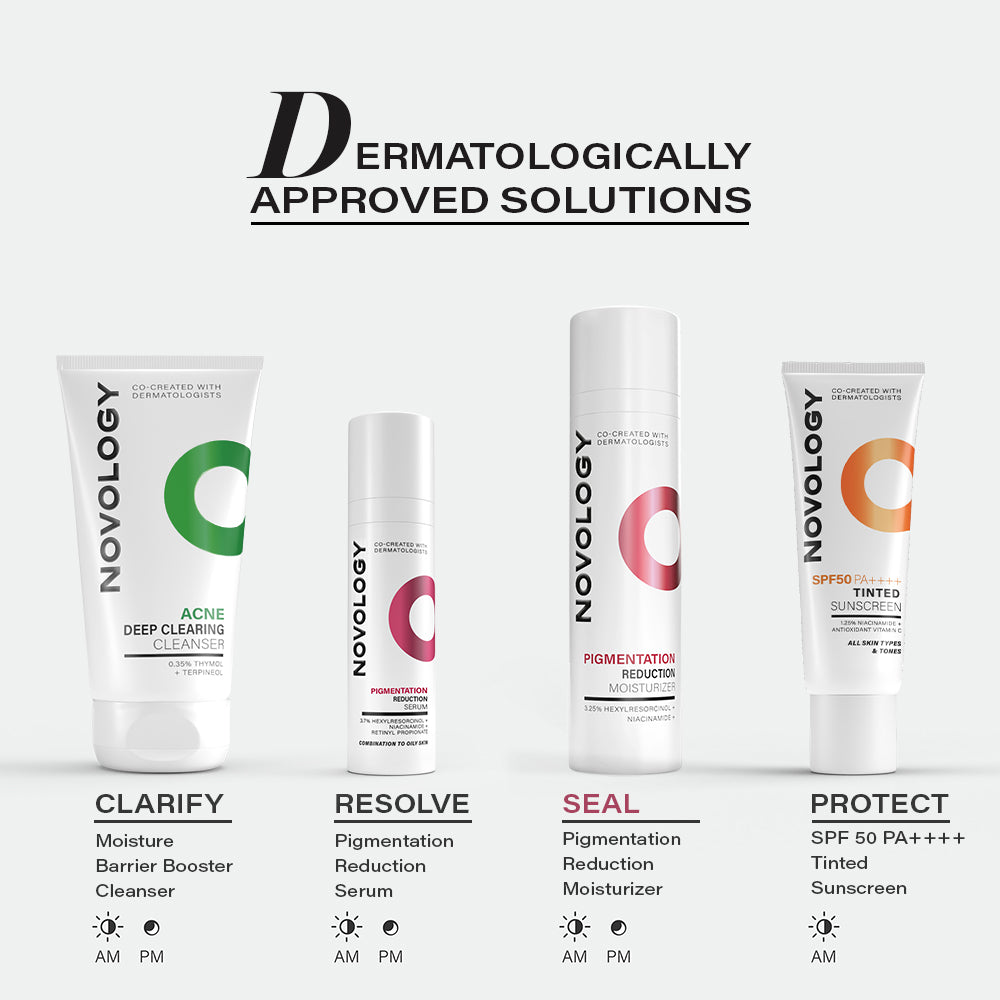 Novology's Pigmentation Reduction Moisturizer, co-created with dermatologists, is clinically proven to reduce pigmentation and dark spots from week 4. It is a quick absorbing and hydrating formula which gives instant brightness.