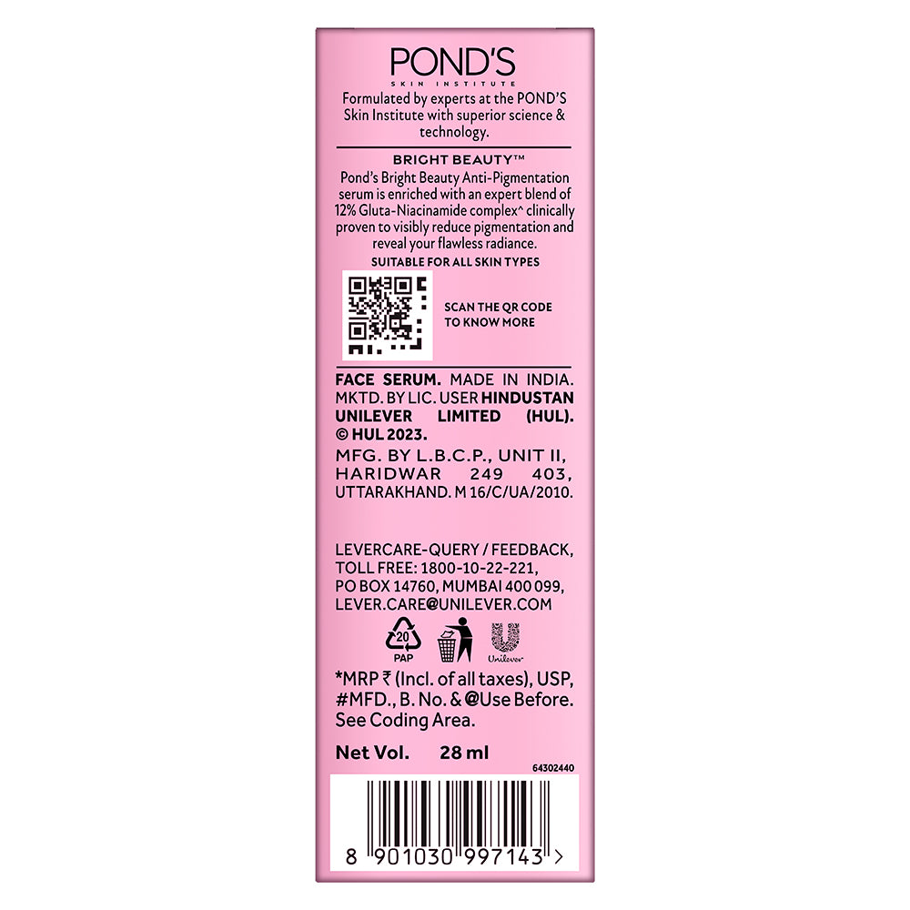 Discover the key to unlocking the flawless radiance of your skin with Pond's Bright Beauty Anti-Pigmentation Serum. Crafted with a powerful blend of 12% Gluta-Niacinamide Complex, this serum is meticulously formulated to combat pigmentation, initiating visible reduction from as early as day 7. Backed by the testament of 9 out of 10 women, its efficacy stands undisputed. Penetrating 10 layers deep into the skin, its lightweight, non-sticky texture ensures swift action in reducing pigmentation. This serum promises 8x spot-reduction for flawless radiance. Application is effortless: dispense 2-3 drops onto the higher part of your cheeks, then delicately pat and blend across your face to unveil flawless radiance. For optimum results, seamlessly integrate it into your skincare regimen following cleansing with our Bright Beauty Facewash. Post-serum application, lock in the moisture and attain your natural glow with our Bright Beauty Gel Crème. Experience the profound transformation facilitated by Pond's Bright Beauty Anti-Pigmentation Serum, an indispensable addition to your skincare arsenal, promising flawless radiance with each and every application. Shop our Bright Beauty range which includes our Bright Beauty Anti-Dullness facewash, Bright Beauty Anti-Pigmentation Serum, Bright Beauty Anti-Spot Serum Cream and Bright Beauty Anti-Spot Gel Crème. Go, elevate your skincare routine today!